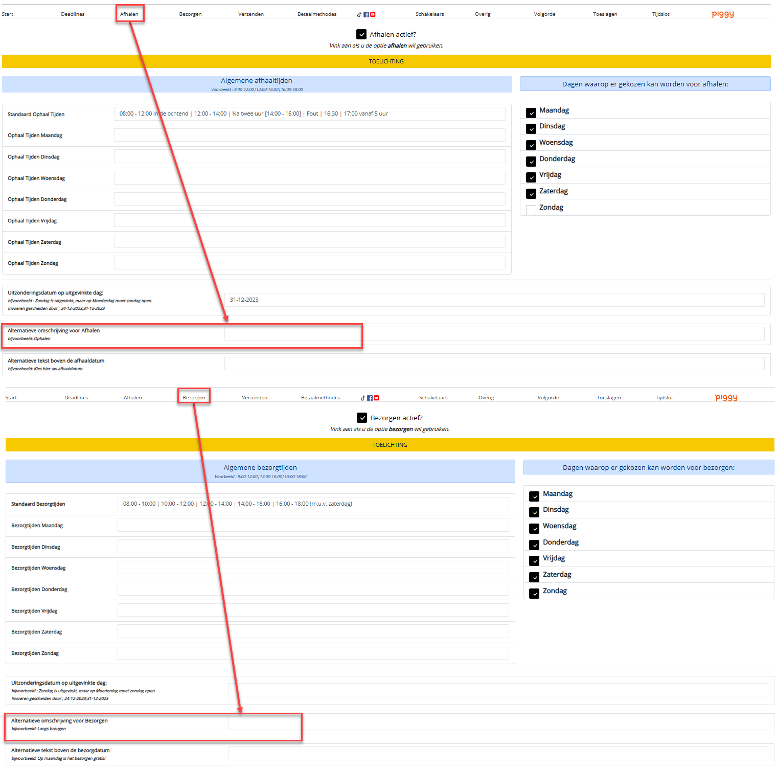 Afhalen / bezorgen omschrijving aanpassen.