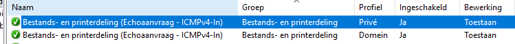 Hiervoor stel je "Bestands- en Printerdeling(Echoaanvraag - ICMPv4-In)" in voor Privé en domein toestaan.