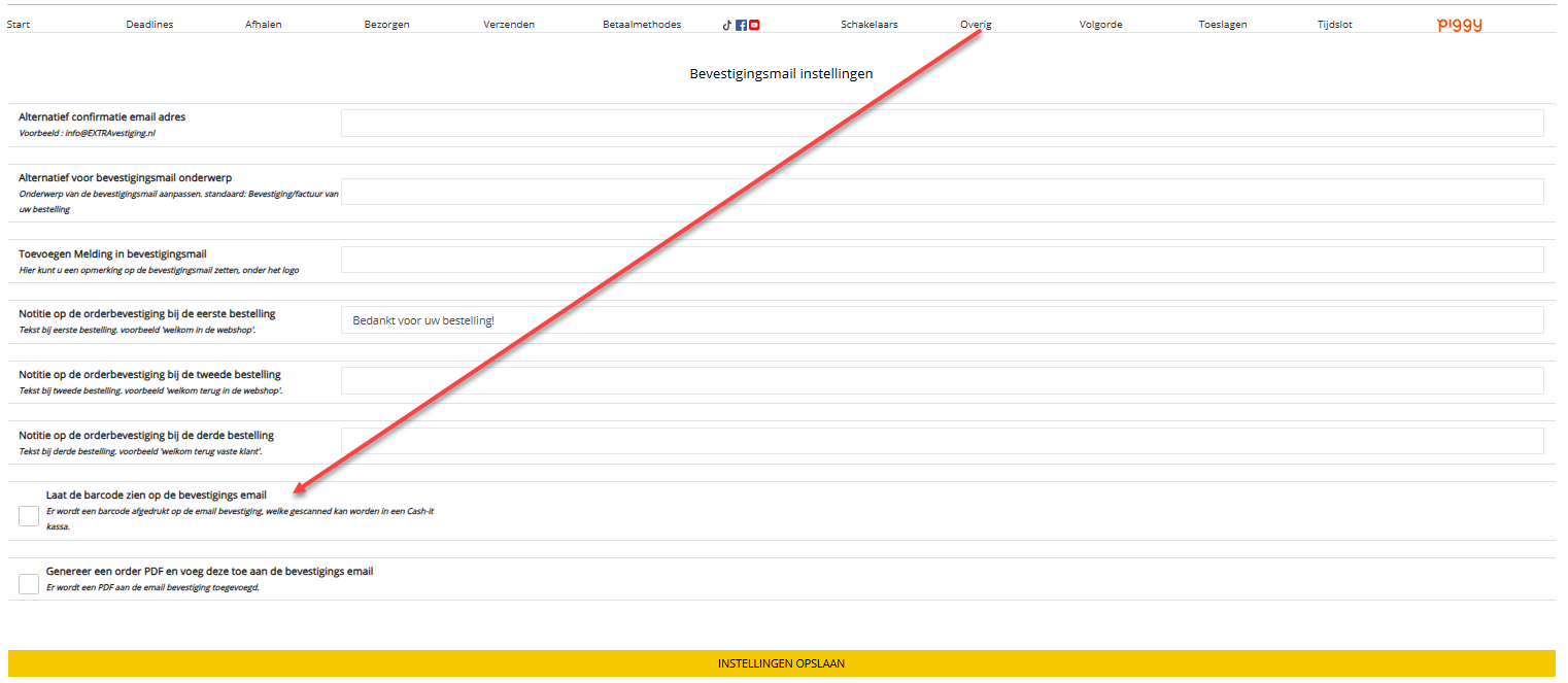 Is het mogelijk om een barcode te laten afdrukken in de bevestigingsmail van de webshop.