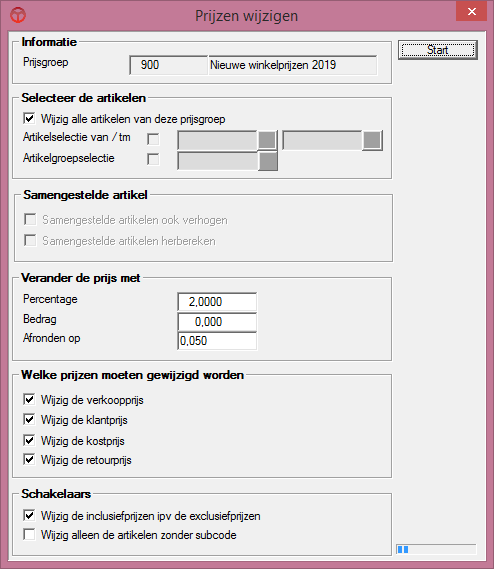 - Hier kunt u een artikel (groep) selectie maken (in dit voorbeeld verhogen we alles met 2%)