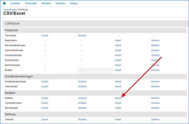 Kies als eerste voor de optie “Import” bij “Relaties”