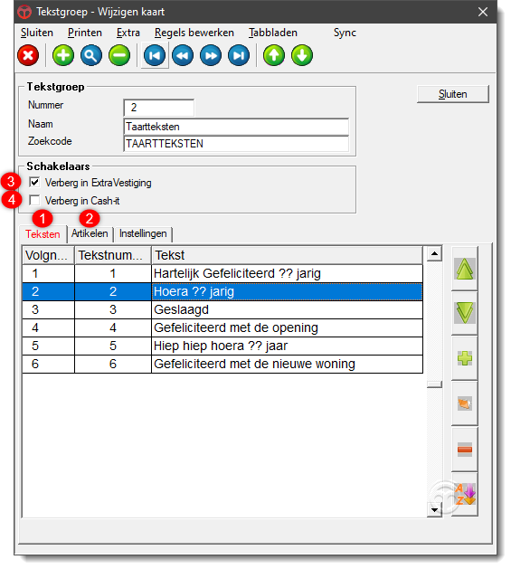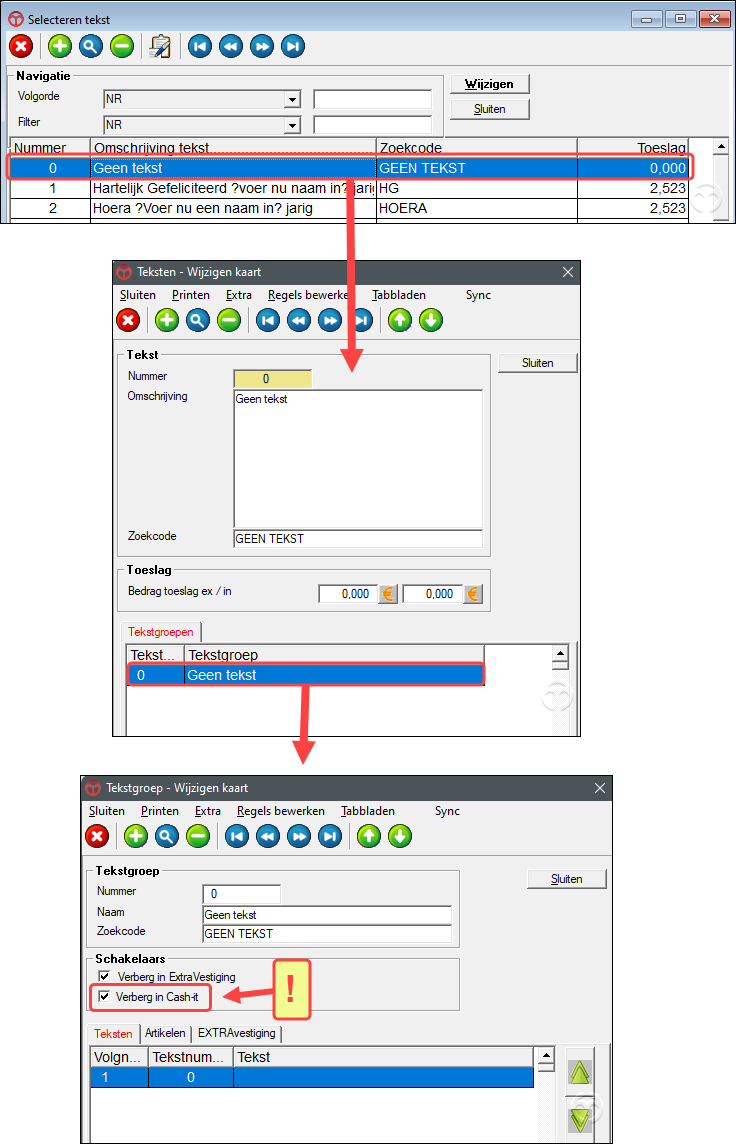 De teksten worden in een tekstgroep toegevoegd, die vervolgens weer aan verschillende artikelen of artikelgroepen kunnen worden gekoppeld.