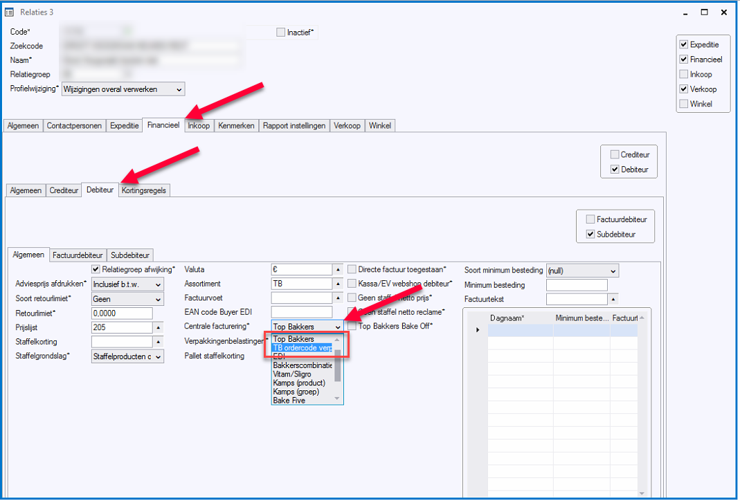In tabblad [Financieel - Debiteur] kunt u kiezen bij [Centrale facturering] voor [Top Bakkers] of [TB ordercode verplicht]