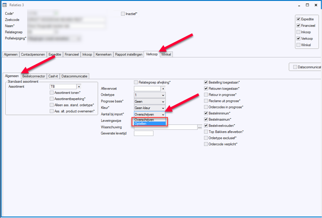 In het tabblad [Verkoop - Algemeen] kunt u kiezen bij [Aantal bij import] voor [optellen] of [overschrijven]