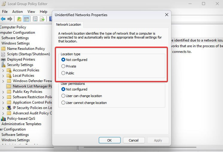 Stel bij Locatietype de gewenste netwerkprofiel en klik op OK.