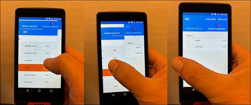 Wil je hierna naar het Product overzicht waarna je werkelijk kunt gaan bestellen, dan is het mogelijk om van rechts naar links te swipen en kun je controleren of de bestelling in orde is, waarna je kunt bestellen via de gelijknamige knop.