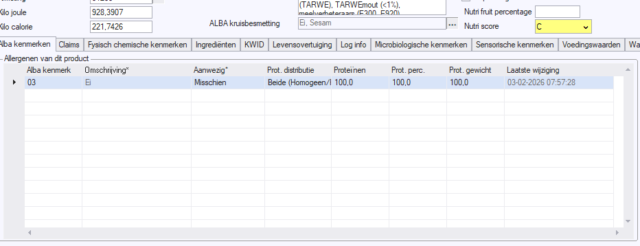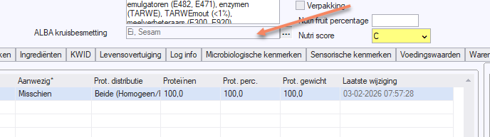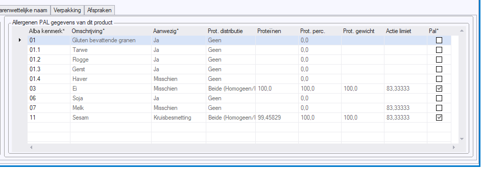 En er is bij product specificatie een veld ALBA kruisbesmetting bij gekomen. Hier worden de allergenen getoond welke de PAL normering via kruisbesmetting hebben overschreven.