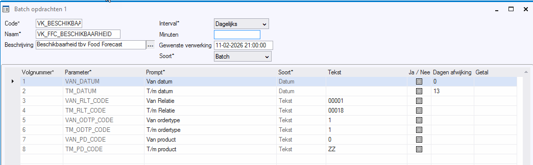 Er dient een batch opdracht gemaakt te worden, welke dagelijks de beschikbaar voor de producten ten behoeve van Food Forecast bepaald. Bij de beschikbaarheid wordt gekeken naar feestdagen, bijzondere dagen, niet leverbaarheid per dag voor de relatie en producten, seizoenen, assortiment en blokkeringen.